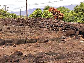 Very little of the original skill of the Menehune stoneworkers is visible any more. The Menehune shaped and fitted their stones. The simple piling of rocks as shown here was a later Hawaiian style. In 1819, by edict of King Kamehameha II, the Hawaiian religious system was overthrown because it had become too burdensome to the people (especially to the chiefs). Priesthoods were abolished, images were cast down, and heiaus were taken over for common purposes. Poliahu Heiau was used by Queen Deborah Kapule, wife of the last king of Kauai, Kaumuali'i, as a corral for livestock.