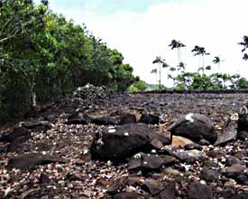 This is the only respectful entry into the heiau, at the left or southeastern corner. Behind the trees on the left is a cliff that drops down to the Wailua River. Some people like to meditate inside the space, which is fine. Some people like to leave offerings on the walls, but that does not respect Hawaiian tradition. Some Hawaiians believe you should enter a heiau with a ti leaf around your neck or in your hand.