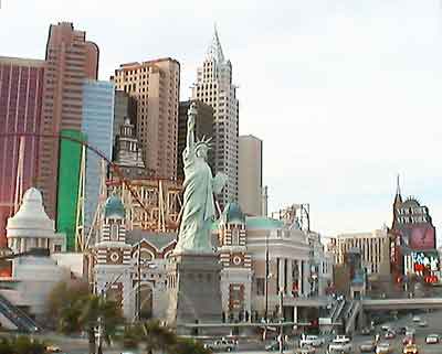 This is a a view of the casino "New York New York" in the center of the Las Vegas Strip on the corner of Las Vegas Boulevard and Tropicana. The MGM Grand, Excalibur, and the old Tropicana casinos are on the other corners, but their photos didn't turn out well. |