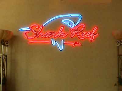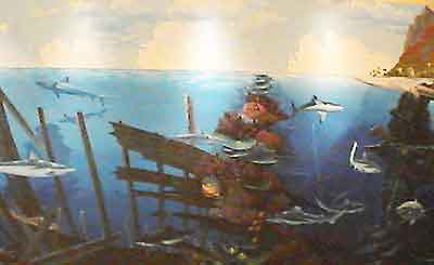 The aquarium features predators of all kinds, including pirhana from the Amazon and many kinds of sharks. I didn't have a camera on the tour, but this painting shows what part of the aquarium looked like. |